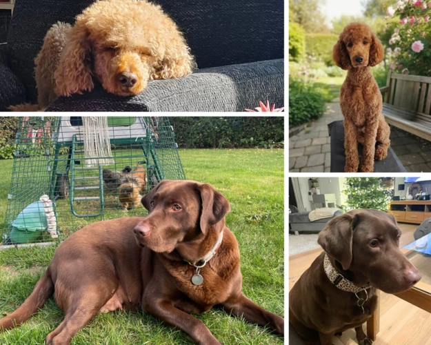 Sie ist eine braune, reinrassige Labradorhündin und wurde von einem großen, reinrassigen braunen Großpudel gedeckt.